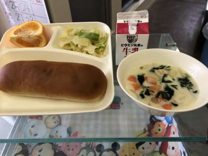 ほうれん草のクリームシチュー、キャベツのサラダ、いよかん、黒糖パン、牛乳。