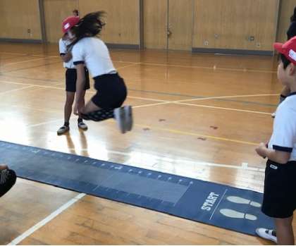2月13日(水)1時間目、5年2組は体育館で立ち幅跳びの記録を測定していました。1年間で何センチメートル記録を伸ばせたでしょうか。記録測定の後バスケットボールをしていました。