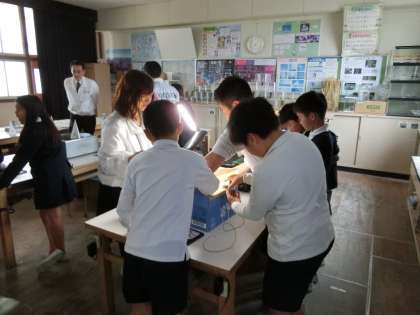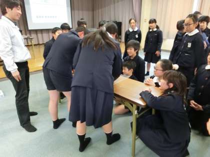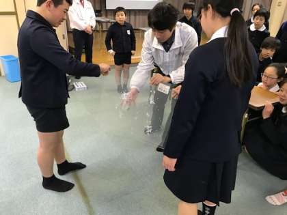「京セラドキュメントソリューションズ」の方々より、コピー機の仕組みについて出前授業をしていただきました。コピーには静電気が使われていることを知り、理科室での実験では思い思いの絵柄を静電気によって浮かび上がらせ、紙に何度も写す作業をしていました。