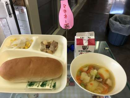 まぐろのしょうゆマヨネーズ焼き、鶏肉とじゃがいものスープ煮、だいこんのサラダ、コッペパン、マーガリン、牛乳。