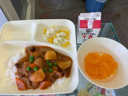 大人気のハヤシライスでした。みかん(缶)もついていてみんなの「おいしい顔」が輝いていました。