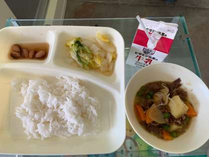 肉じゃが、はくさいのゆず風味、とら豆の煮もの、米飯、牛乳。