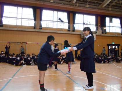 6年生からは在校生に「手作りぞうきん」のプレゼントがありました。