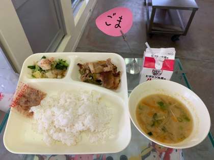 豚肉のごまだれ焼き、みそ汁、こまつなのおひたし、米飯、牛乳。