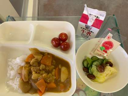 チキンカレーライス、金時豆と野菜のサラダ、プチトマト、牛乳。