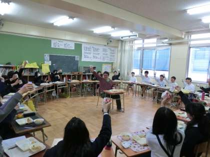 小学校生活最後の給食でした。3クラスとも丸くみんなで輪になって、お互いの顔を見合うようにして最後の給食を食べていました。