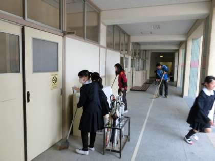 唯一校内に残った5年生たちが校内清掃からみんなよくがんばっていました。会場の椅子並べも、いったん並んでいた椅子を周りにのけて床を拭いてからの作業となりましたが、協力して会場を作り上げてくれました。いよいよ明日は卒業式となりますが、5年生たちを見ていると明日は在校生の代表として式を盛り上げてくれると思います。