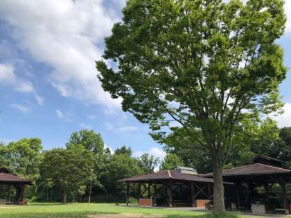 キャンプ場に着きました。木陰や屋根の下は風が爽やかです。信太山の自然についてお話しを聞き、火おこし体験が始まります。