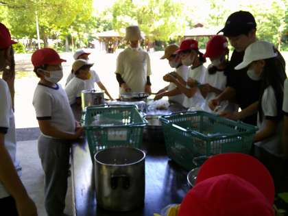 米をとぐひと、野菜を切る人、かまどの火を守る人。役割分担してカレーを作りました。もちろんかまどの火は、みんなでおこした火です。ファイヤーランタンからうまくかまどに火がついたときは、思わず拍手!どの班も、最高においしいカレーができあがりましたね。