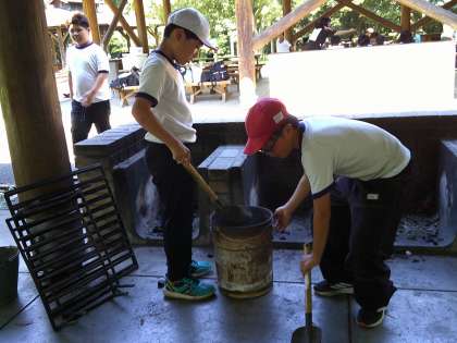 食べた後はもちろん、協力して後片付けです。特に煤だらけになった鍋を磨く仕事や、かまどの掃除は大変です。