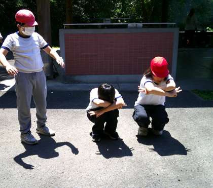 あら?片付けがひと段落したのでしょうか?面白い形の影をつくっている子たちがいました。とてもいい天気ならではの遊びですね。