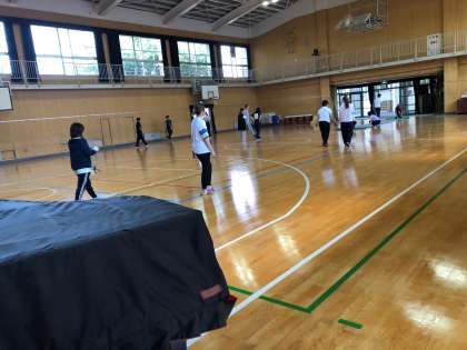 夏休み中に実施した講堂床の改修工事が完了し、床は顔が映るほどピカピカになっています。コートのラインも職人さんが特殊な塗料で美しく引いてくださいました。