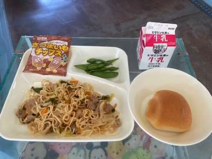 焼きそば、えだまめ、おさつチップス、ミニコッペパン、牛乳