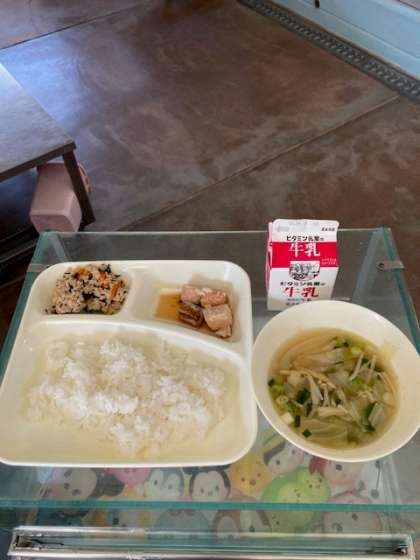本日の献立 さけのしょうゆだれかけ、五目汁、高野どうふのいり煮、ごはん、牛乳