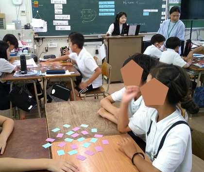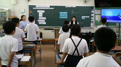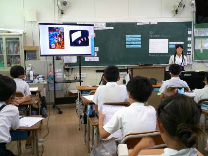 夏休みの思い出を英語で発表し、発表を聞いている児童は、「Wonderful! 」「Good job!」などとリアクションしていました。