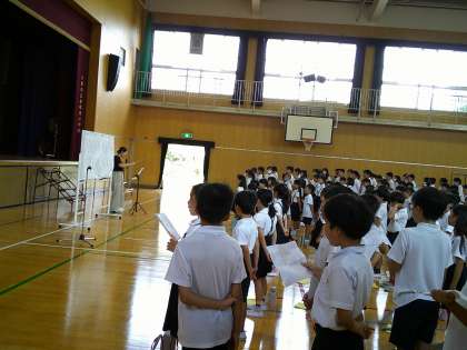 今日の児童集会では、創立150周年を記念してみんなでつくった歌、『未来へ一歩』を練習しました。