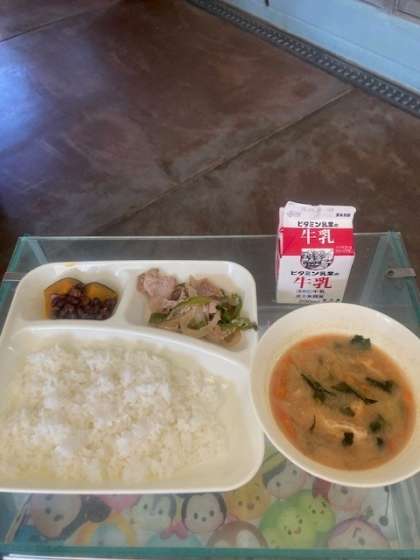 本日の献立 豚肉の甘辛焼き、みそ汁、かぼちゃのいとこ煮、ごはん、牛乳
