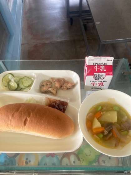 鶏肉のバジル焼き、ベーコンと野菜のスープ煮、キャベツときゅうりのサラダ、コッペパン、いちごジャム、牛乳