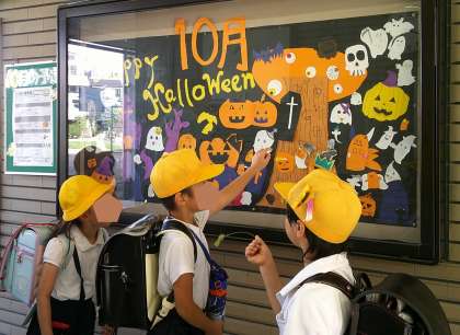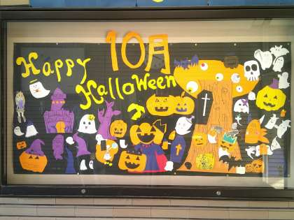 かわいいおばけや不気味なかぼちゃ、おしゃれな魔女などが勢ぞろいしています。登校してきた子どもたちは早速足を止め、「わあ、すごい!」と見入っていました。