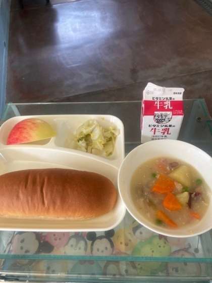 鶏肉とさつまいものシチュー、はくさいのピクルス、りんご、こくとうパン、牛乳