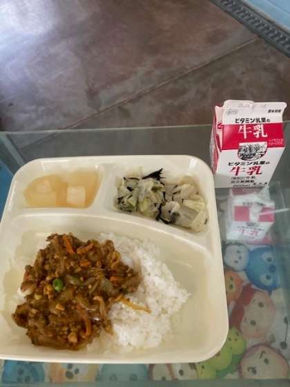 大豆入りキーマカレーライス、キャベツのひじきドレッシング、和なし(缶詰)、ごはん、牛乳
