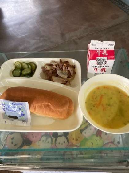 豚肉のガーリック焼き、コーンスープ、きゅうりのバジル風味サラダ、コッペパン、ブルーベリージャム、牛乳