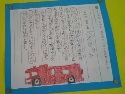 調べた乗り物が、何をする乗り物でどんなつくりになっているのか、友だちと伝え合いました。絵も、よく見て描けています。学校に来られた際は、ぜひがんばりコーナーをご覧ください。