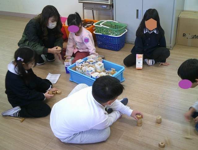 最初の時間は、昔あそび、ランドセル、折り紙、ひらがなのコーナーに分かれて、1年生がミニ先生になりました。ランドセルコーナーでは、実際にランドセルを背負ったり、朝の用意の体験をしたりしました。「重た~い」「これくらいやったらいける」といった声も聞こえていました。