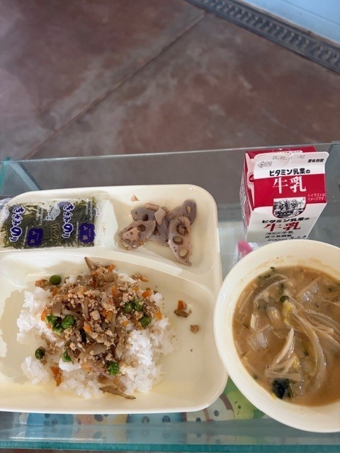 鶏ごぼうご飯、きざみのり、みそ汁、焼きれんこん、牛乳
