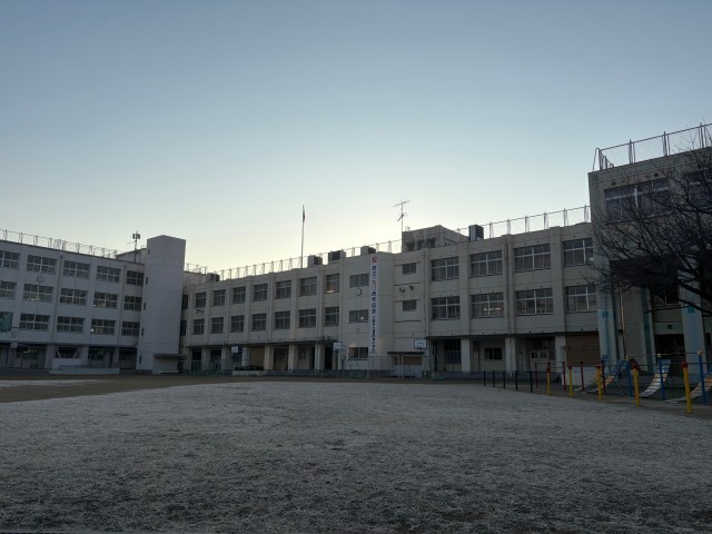朝の運動場には芝生一面に霜が降り、芝生が真っ白になっています。まるで雪景色のようです。