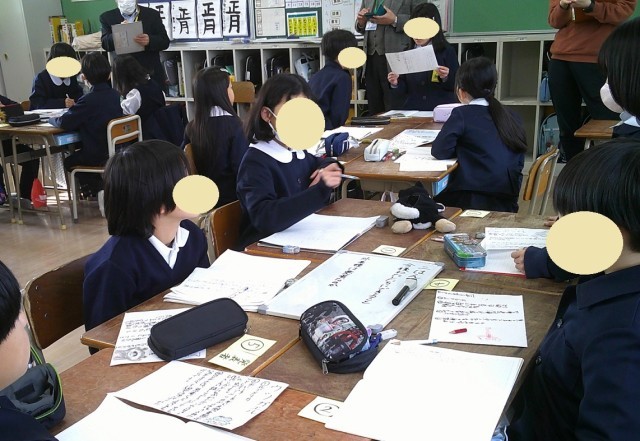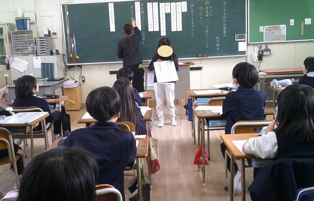 3年生で国語科の研究授業を行いました。『カミツキガメは悪者か』の学習を通して、子どもたちはカミツキガメ以外の外来種についても興味をもって調べ、「紹介カード」にまとめました。グループでの交流では、友だちの発表をメモを取りながら聞き、今後自分たちにできることを話し合いました。
