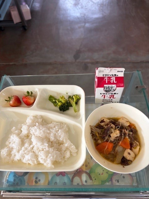 すきやき煮、ブロッコリーのしょうがづけ、いちご、ごはん、牛乳