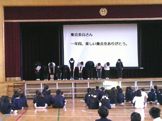 最後には、集会委員会の全員が前に並んであいさつし、一年間楽しい集会を考えてくれたことに全員でお礼を言いました。