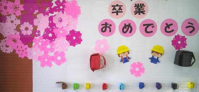 玄関掲示は、6年生の卒業を祝い、小学校生活を振り返ることができるような作品に代わりました。