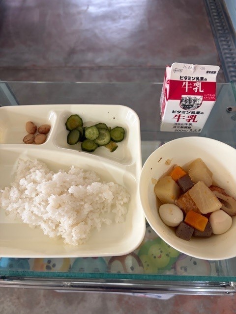 関東煮、きゅうりの梅風味、とら豆の煮もの、ごはん、牛乳