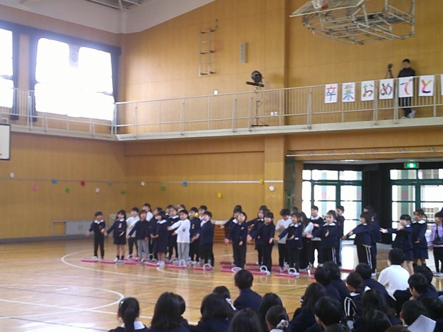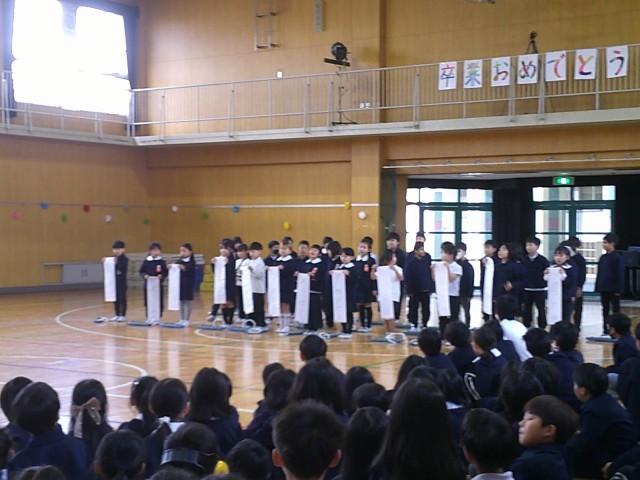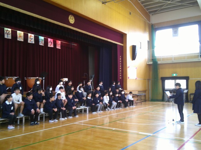 1年生から5年生が、歌や演奏や呼びかけで、卒業をお祝いしました。