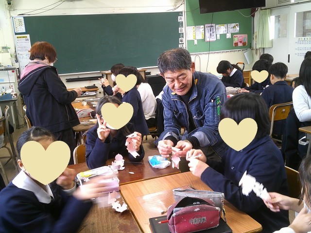 地域にお住いの紙細工作家の方にお越しいただき、5年生がシーサー紙細工を体験しました。