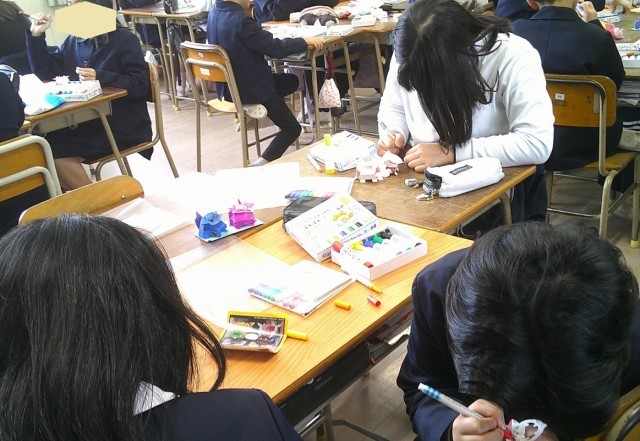 紙細工は、最初は「え、どこで折るの?」「やまおりってどうするの?」など戸惑いの声もありましたが、グループで教えあったり、教えていただいたりしながら形作ることができ、最後の彩色では、みんな一心不乱に作業していました。個性的な一対のシーサーが完成しましたので、ぜひ、おうちに飾っていただきたいと思います。