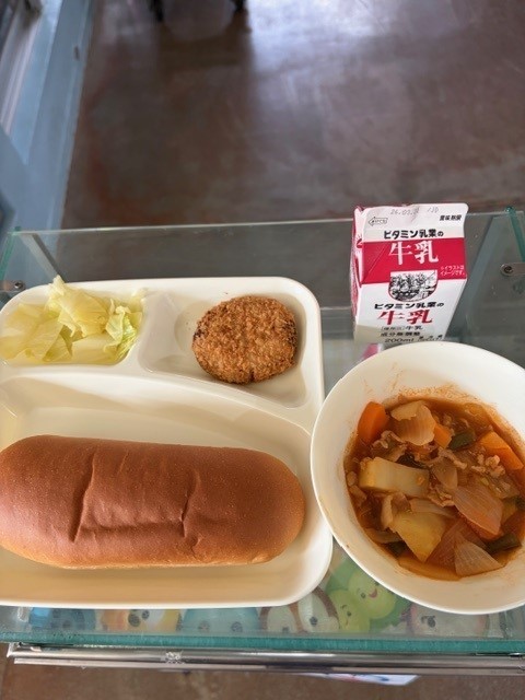 チキンレバーカツ、ケチャップ煮、キャベツのサラダ、こくとうパン、 牛乳