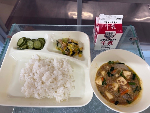 マーボーどうふ、きゅうりの中華あえ、ツナとチンゲンサイのいためもの、ごはん、牛乳