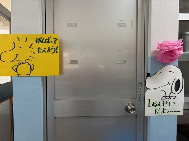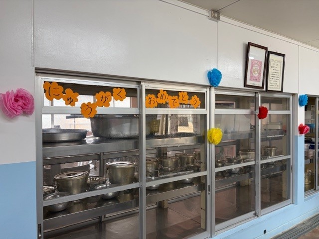 1年生は小学校で初めての給食ですね。入学を祝って、給食室も調理員さんがかわいく飾ってくれています。