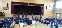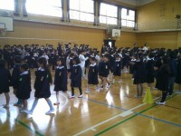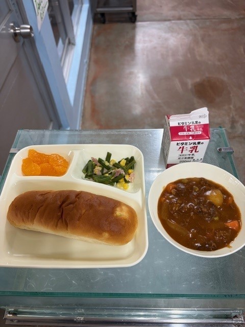 ビーフシチュー、ベーコンとさんどまめのソテー、みかん(缶詰)、おさつパン、牛乳