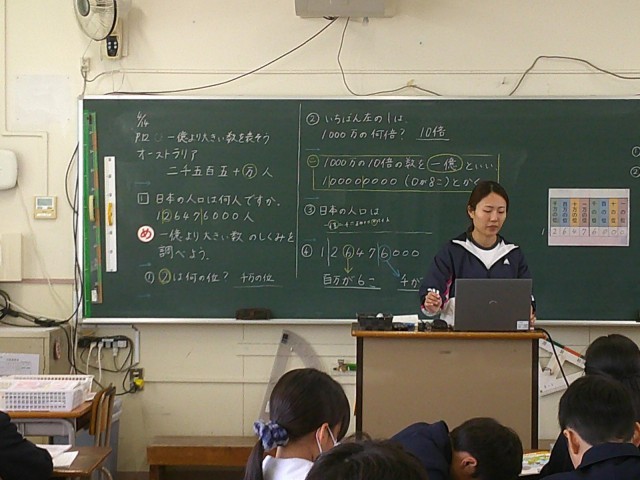 4年1組では「一億より大きな数の仕組み」について学習しました。子どもたちは、これまでに学んだ「十、百、千、万」という位のつながりをもとに、「億」や「兆」といったさらに大きな位へと考えを広げていきました。