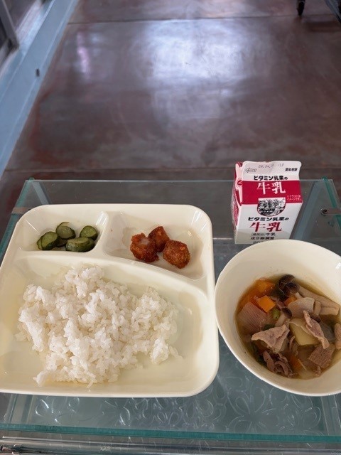 まぐろのオーロラ煮、豚肉と野菜の煮物、きゅうりのゆず風味、ごはん、牛乳