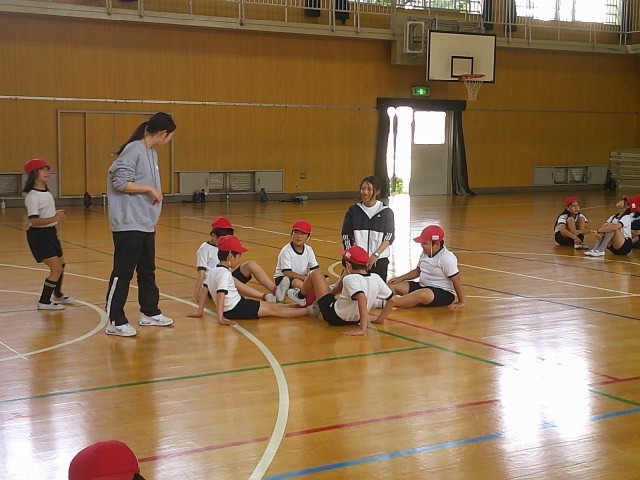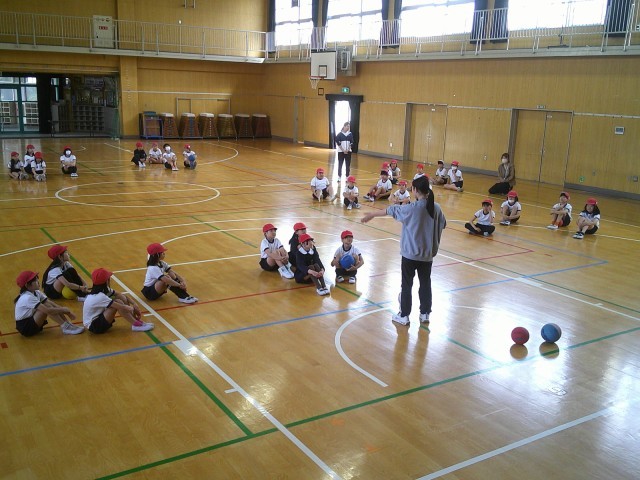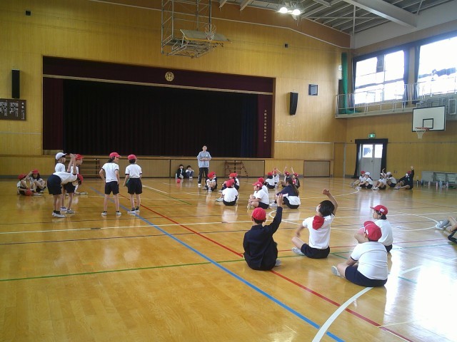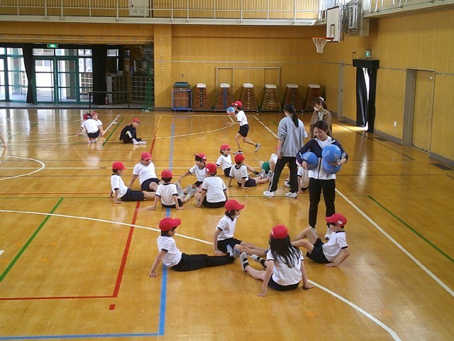 4年生の合同体育で、ボールを使った「からだほぐし運動」に取り組みました。円になって座りながらボールを運ぶ活動では、「どうすればうまくつながるか」「次の人に渡しやすくするにはどうしたらよいか」など、チームで気づきや工夫を出し合いながら挑戦していました。