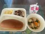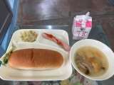 ウインナーのケチャップソース、スープ、焼きツナキャベツ、コッペパン、マーガリン、...