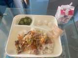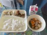 本日の献立 金時豆の中華おこわ、まる天と野菜のうま煮、パインアップル(缶詰)、こ...