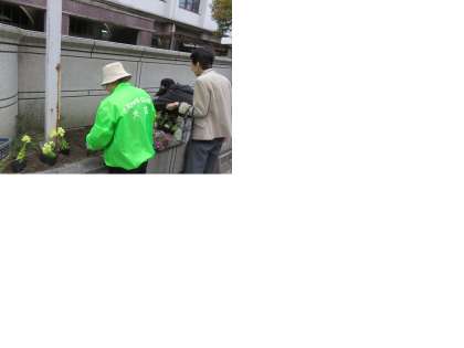 四季折々に玄関の花の管理をしてくださっている中泉尾地域「緑のリーダー」の方たちが、今回も色とりどりの花を植えに来てくださいました。雛菊や金魚草などの可愛い花で玄関は一気に華やぎました。