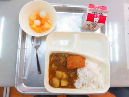 今年の入学祝献立は、子どもたちにとっても人気のカツカレーでした。6年生が用意してくれるのを待ち遠しそうに、でもとってもお行儀よく待つことができました。おいしかったようでお変わりする人もたくさんいてました。中には 先生、カツおいしいからもういっこちょうだい! ごめんね。カツは一人一つだけなの といった会話も。この調子でいっぱい食べてほしいですね。