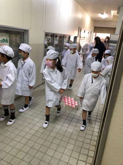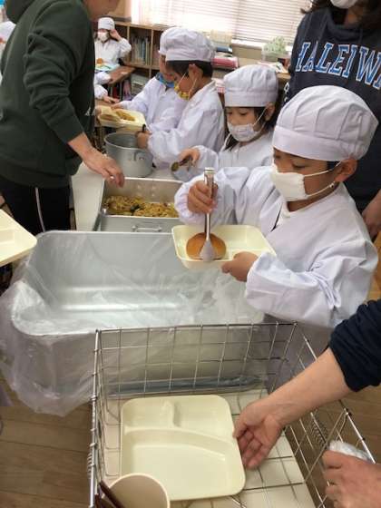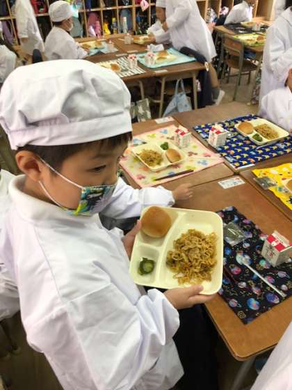 先週までは6年生のお兄ちゃんやお姉ちゃんにお手伝いをしてもらっていた給食の準備も今週からは、いよいよ自分たちですることに。給食室にとりに行って、みんなで「いただきます!」と声をそろえて挨拶をした後、おかずや食器を教室に運びます。慣れない手つきで一生懸命おかずをよそったり、配膳したりとがんばっている1年生です。